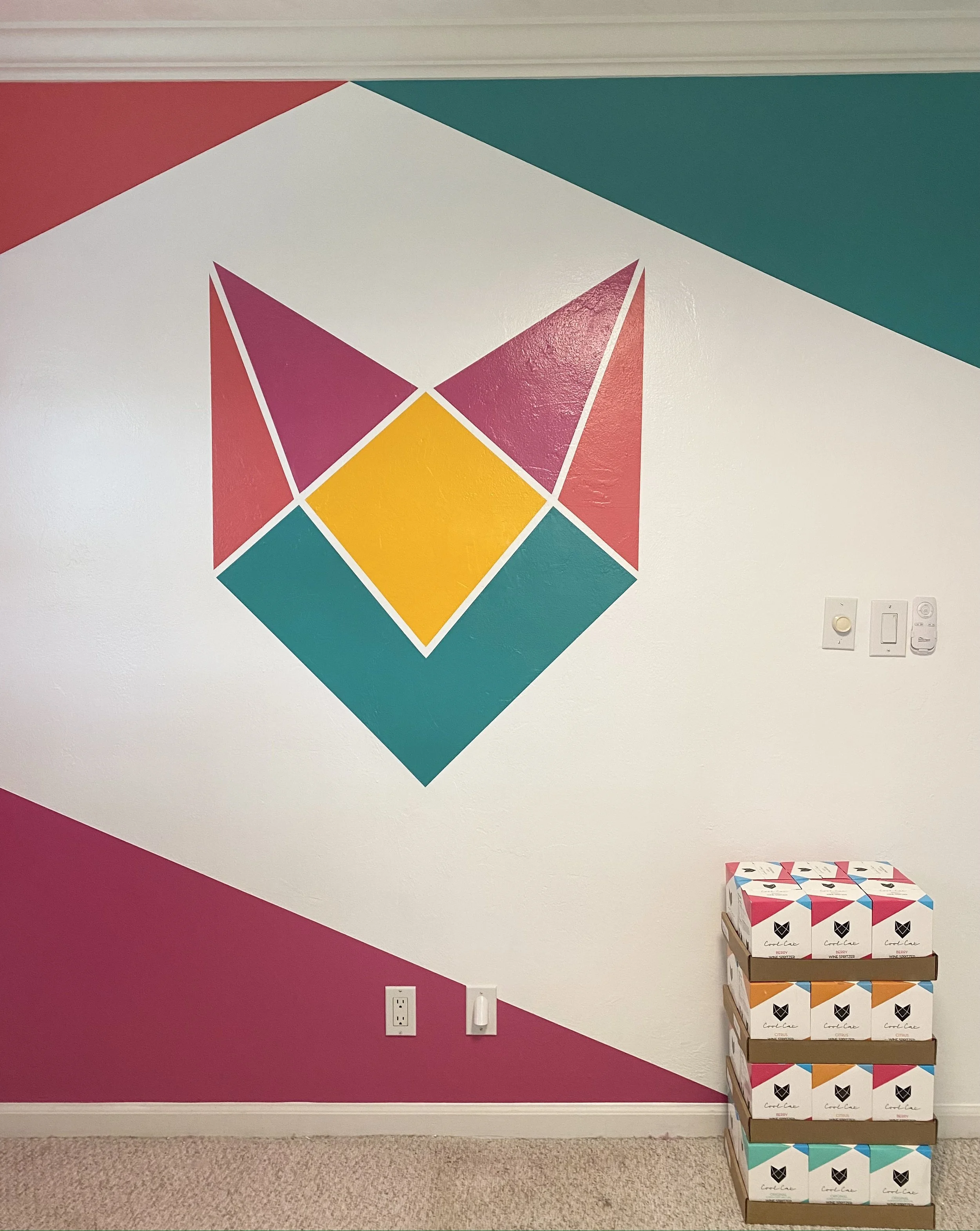 My client came to me with a fun project for her home office. As the VP of sales for a wine spritzer brand, she wanted to create an on-brand design with the company logo as the backdrop for her zoom meetings. The company’s branding uses vibrant colors with geometric patterns. We transformed her home office into a bright, modern, and very on-brand space for her to work and represent her company in style.